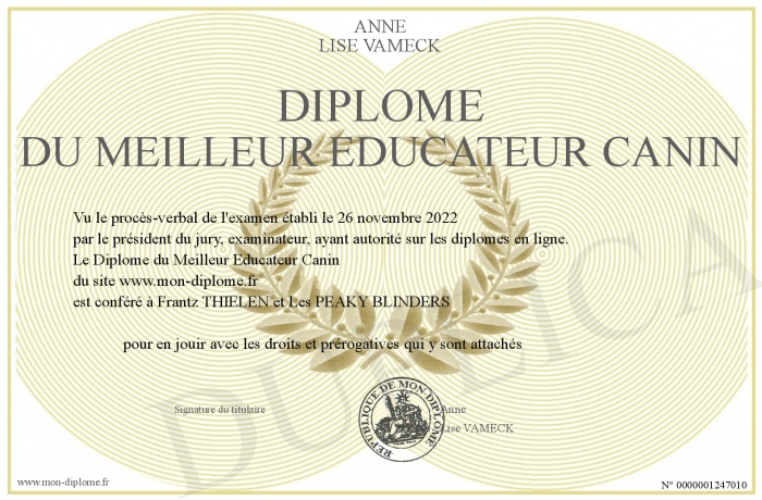 Envoyez par email votre Diplôme du Meilleur Educateur Canin personalisé