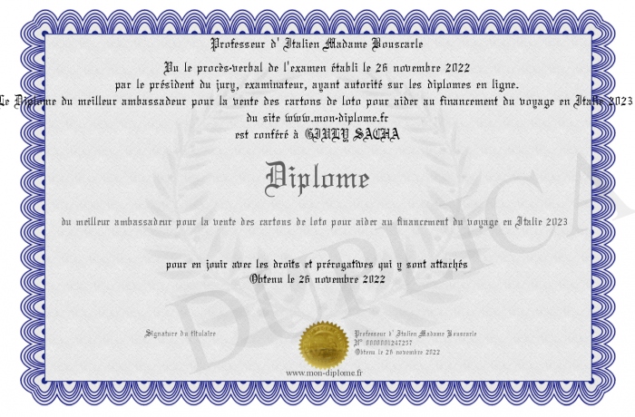 Envoyez par email votre Diplôme du meilleur ambassadeur pour la vente des cartons de loto pour aider au financement du voyage en Italie 2023 personalisé