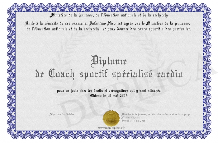 Envoyez par email votre Diplôme de Coach sportif spécialisé cardio personalisé