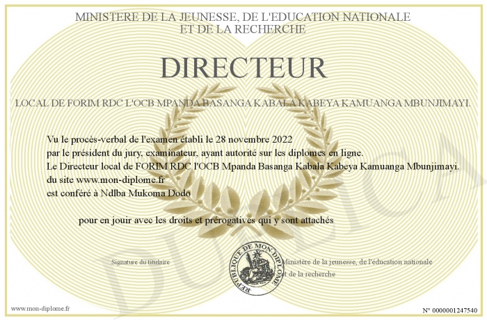 Envoyez par email votre Directeur local de FORIM RDC l'OCB Mpanda Basanga Kabala Kabeya Kamuanga Mbunjimayi. personalisé