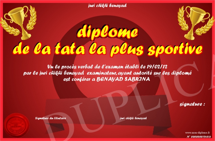 Envoyez par email votre diplome de la tata la plus sportive personalisé