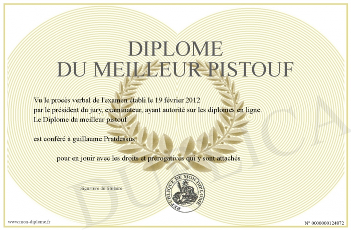 Envoyez par email votre Diplome du meilleur pistouf personalisé