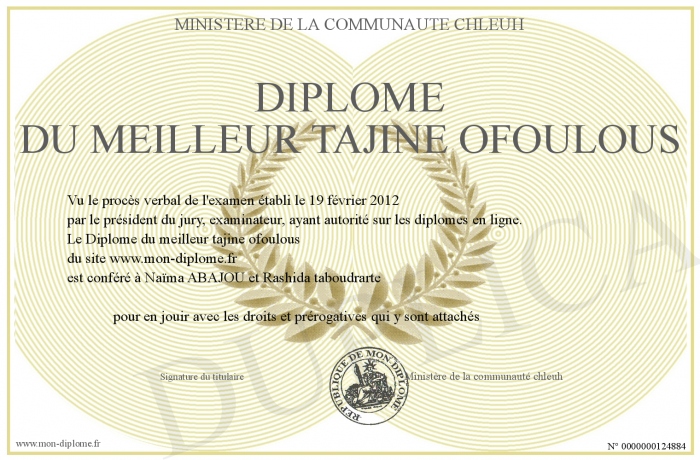Envoyez par email votre Diplôme du meilleur tajine ofoulous personalisé