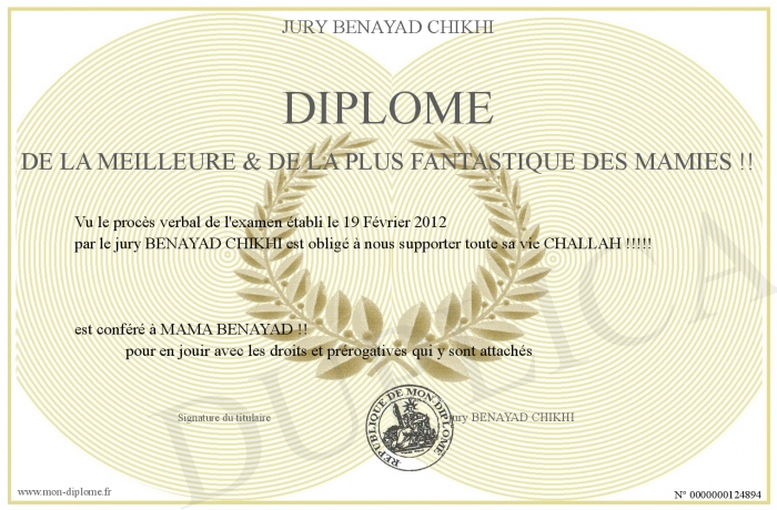 Envoyez par email votre Diplôme de la meilleure & de la plus fantastique des mamies !! personalisé