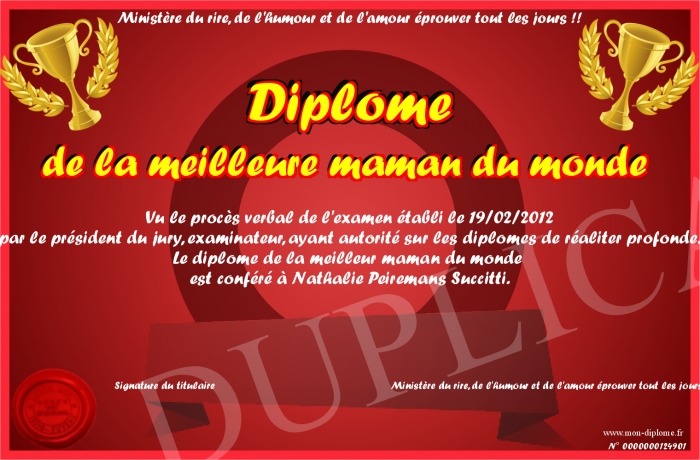 Envoyez par email votre Diplome de la meilleure maman du monde personalisé