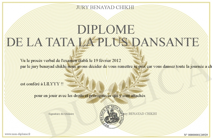 Envoyez par email votre diplôme de la tata la plus dansante personalisé
