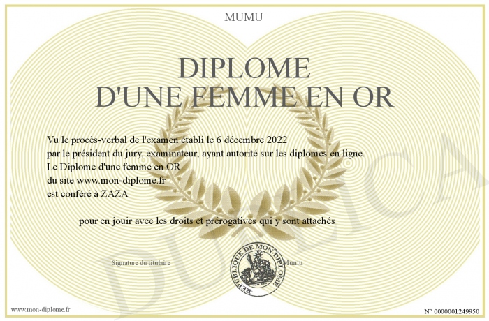 Envoyez par email votre Diplôme d'une femme en OR personalisé