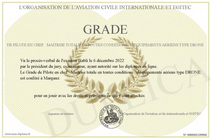 Envoyez par email votre Grade de Pilote en chef Maitrise totale en toutes conditions d'équipements aériens type DRONE personalisé