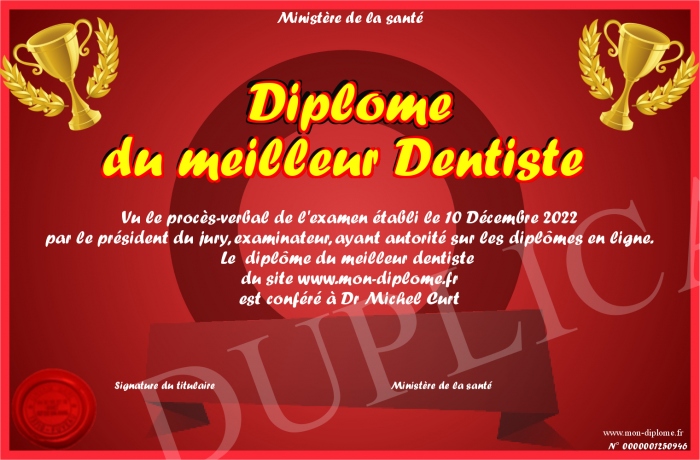 Envoyez par email votre Diplôme du meilleur Dentiste personalisé