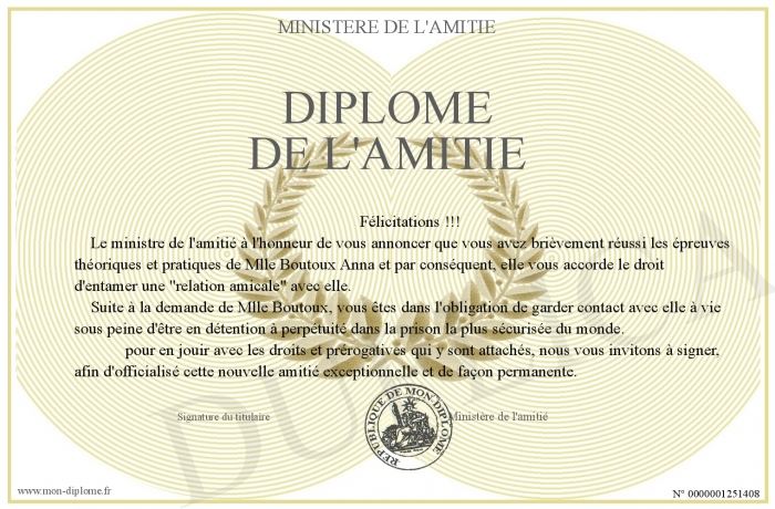 Envoyez par email votre Diplôme de l'amitié personalisé