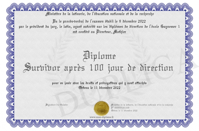 Envoyez par email votre Diplôme Survivor après 100 jour de direction personalisé