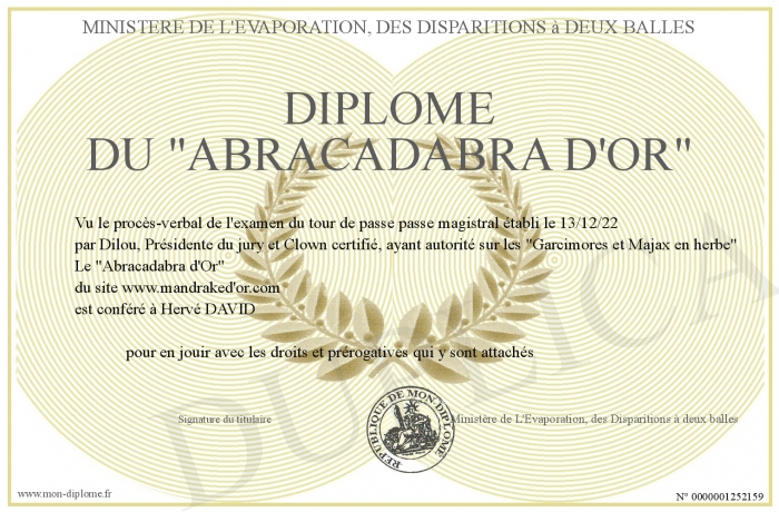 Envoyez par email votre Diplôme du -ABRACADABRA D'OR- personalisé
