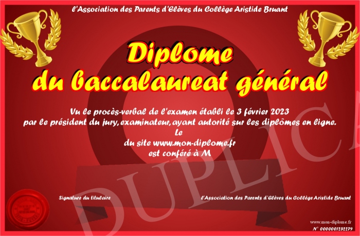 Envoyez par email votre Diplôme du baccalaureat général personalisé