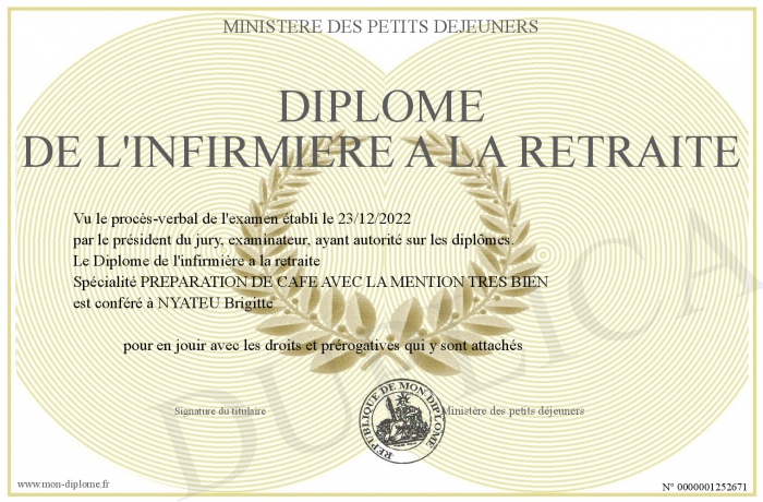 Envoyez par email votre Diplôme de l'infirmière a la retraite personalisé