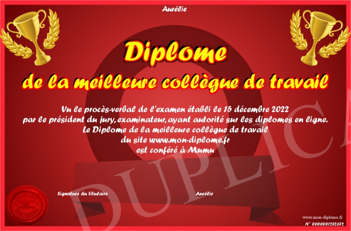 Envoyez par email votre Diplôme de la meilleure collègue de travail personalisé