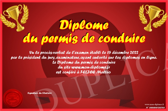 Envoyez par email votre Diplome du permis de conduire personalisé