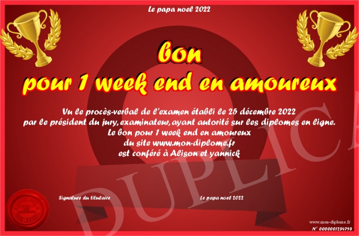Envoyez par email votre bon pour 1 week end en amoureux personalisé