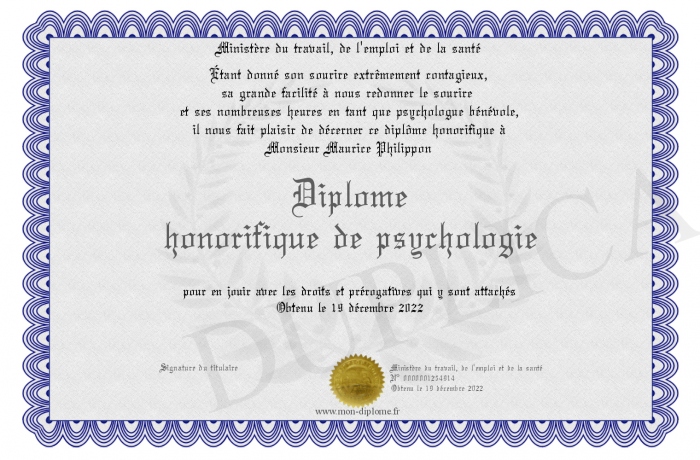 Envoyez par email votre Diplome honorifique de psychologie personalisé