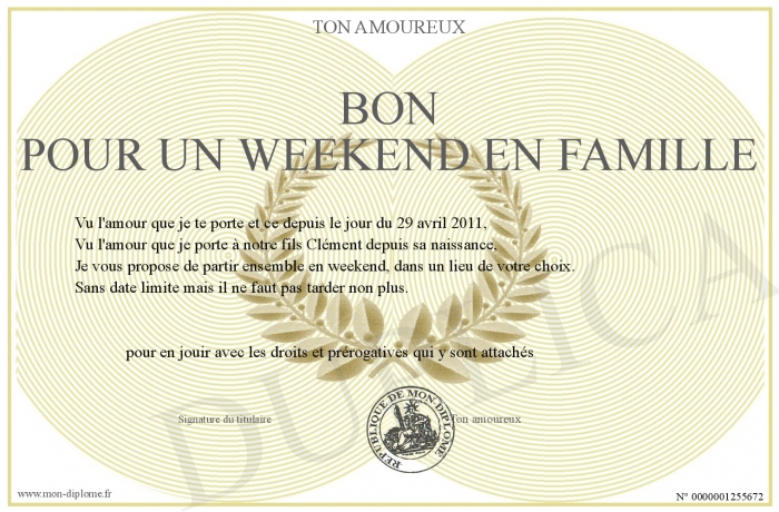 Envoyez par email votre Bon pour un weekend en famille personalisé