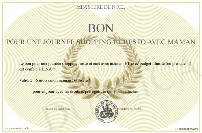 Envoyez par email votre BON POUR UNE JOURNEE SHOPPING ET RESTO AVEC MAMAN personalisé