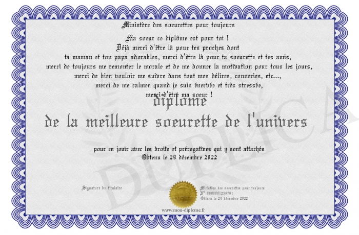 Envoyez par email votre diplôme de la meilleure soeurette de l'univers personalisé