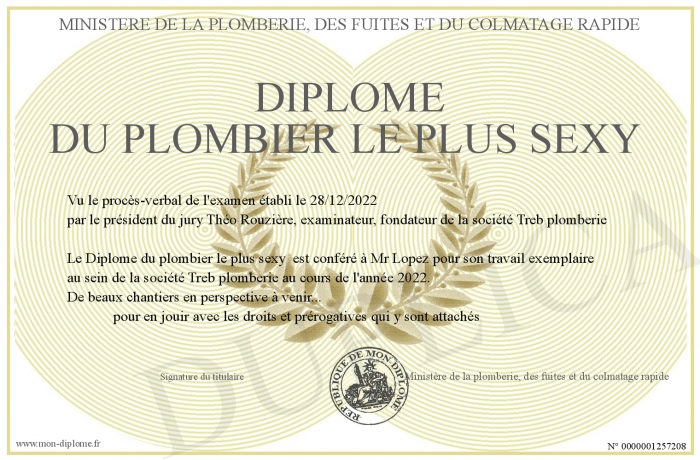 Envoyez par email votre Diplôme du plombier le plus sexy personalisé