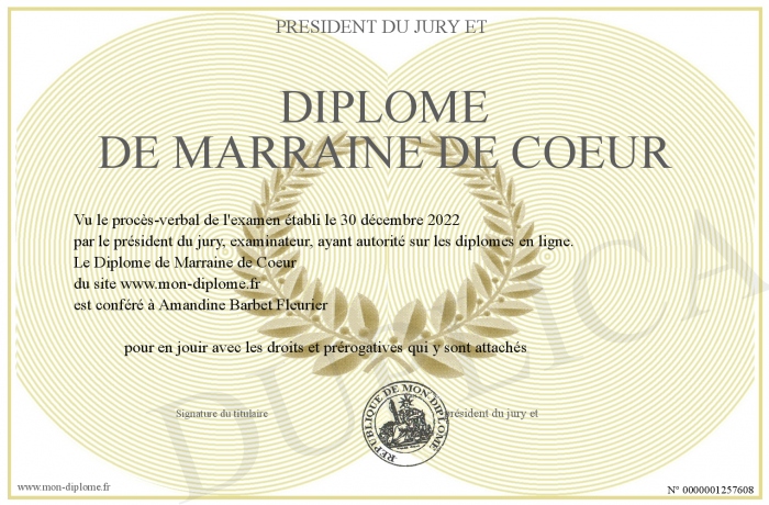 Envoyez par email votre Diplôme de Marraine de Coeur personalisé