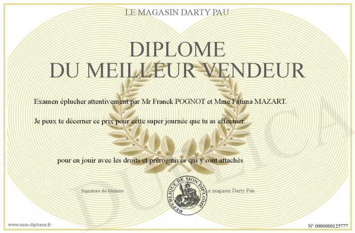 Envoyez par email votre Diplôme du meilleur Vendeur personalisé