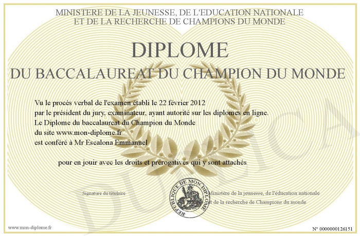 Envoyez par email votre Diplôme du baccalaureat du Champion du Monde personalisé