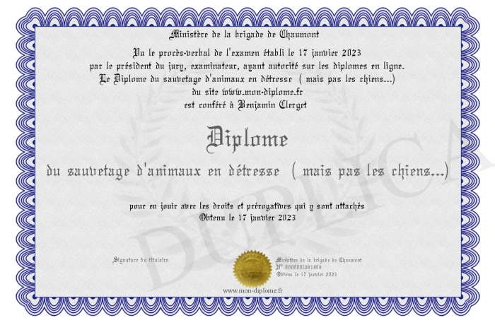 Envoyez par email votre Diplôme du sauvetage d'animaux en détresse ( mais pas les chiens...) personalisé