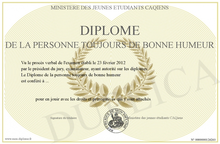 Envoyez par email votre Diplôme de la personne toujours de bonne humeur personalisé