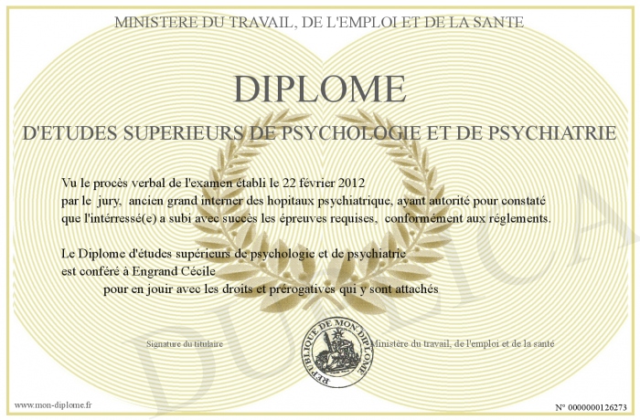 Envoyez par email votre Diplome d'études supérieurs de psychologie et de psychiatrie personalisé