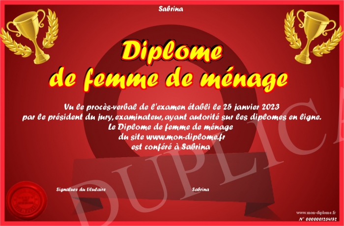 Envoyez par email votre Diplôme de femme de ménage personalisé