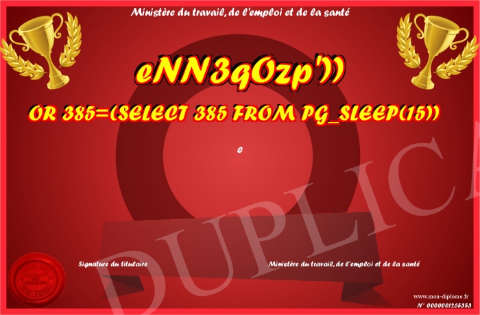 Envoyez par email votre eNN3qOzp')) OR 385=(SELECT 385 FROM PG_SLEEP(15)) personalisé