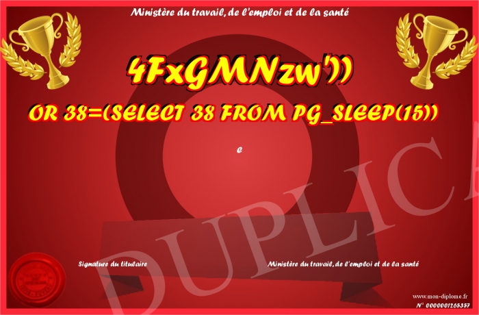 Envoyez par email votre 4FxGMNzw')) OR 38=(SELECT 38 FROM PG_SLEEP(15)) personalisé