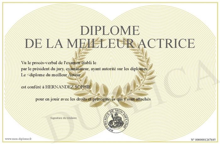 Envoyez par email votre Diplôme de la Meilleur actrice personalisé