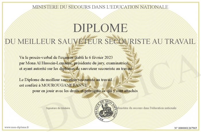Envoyez par email votre Diplôme du meilleur sauveteur secouriste au travail personalisé