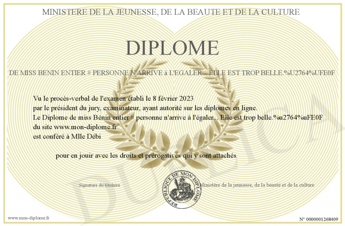 Envoyez par email votre Diplôme de miss Bénin entier # personne n'arrive à l'égaler... Elle est trop belle.%u2764%uFE0F personalisé