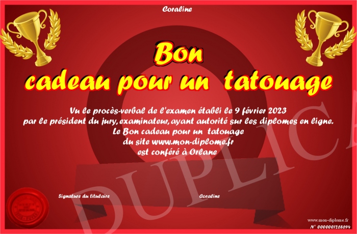Envoyez par email votre Bon cadeau pour un tatouage personalisé