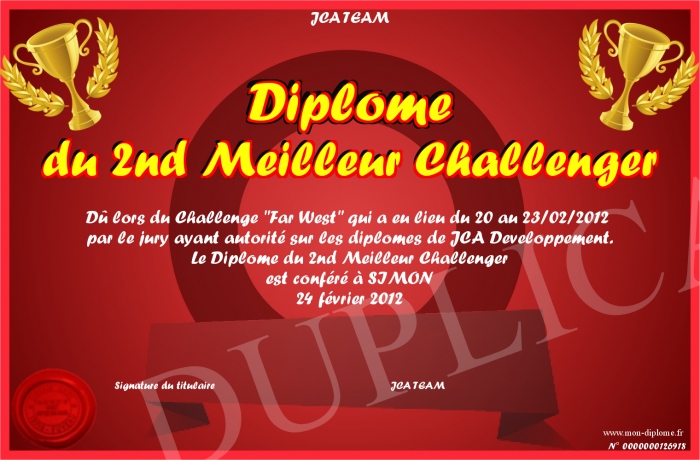 Envoyez par email votre Diplôme du 2nd Meilleur Challenger personalisé