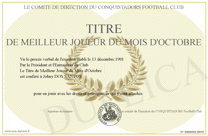 Envoyez par email votre Titre de Meilleur Joueur du Mois d'Octobre personalisé