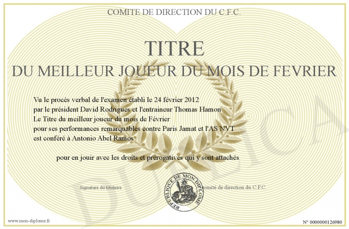 Envoyez par email votre Titre du meilleur joueur du mois de Février personalisé