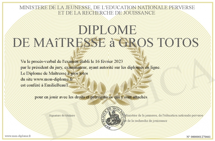 Envoyez par email votre Diplôme de Maîtresse à gros totos personalisé