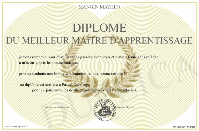 Envoyez par email votre diplôme du meilleur maître d'apprentissage personalisé