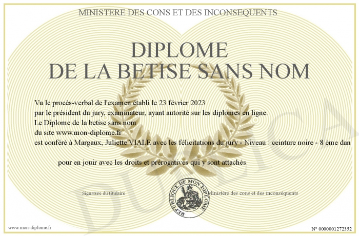 Envoyez par email votre Diplôme de la betise sans nom personalisé