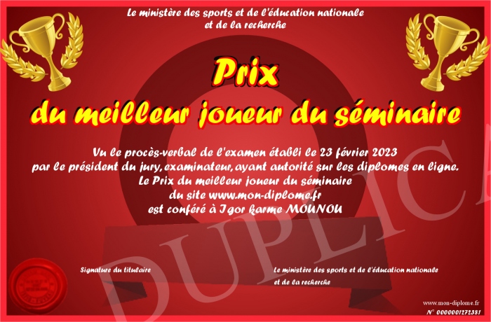 Envoyez par email votre Prix du meilleur joueur du séminaire personalisé