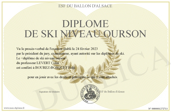 Envoyez par email votre Diplôme de ski niveau ourson personalisé