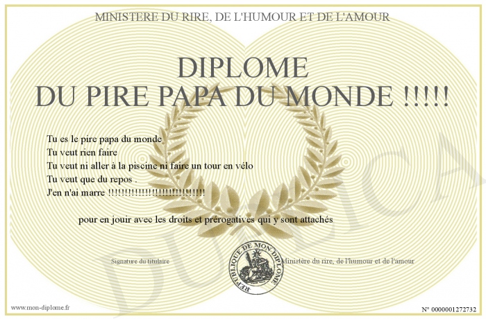 Envoyez par email votre Diplôme du pire papa du monde !!!!! personalisé
