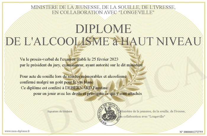 Envoyez par email votre Diplôme de l'alcoolisme à haut niveau personalisé