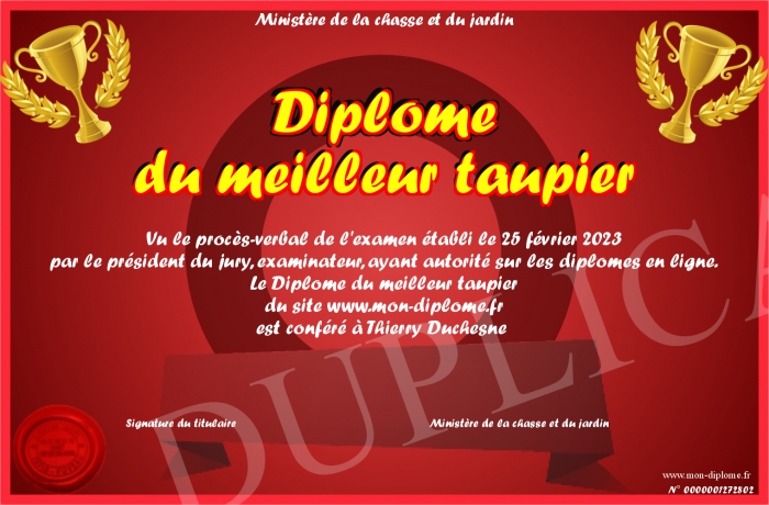 Envoyez par email votre Diplôme du meilleur taupier personalisé